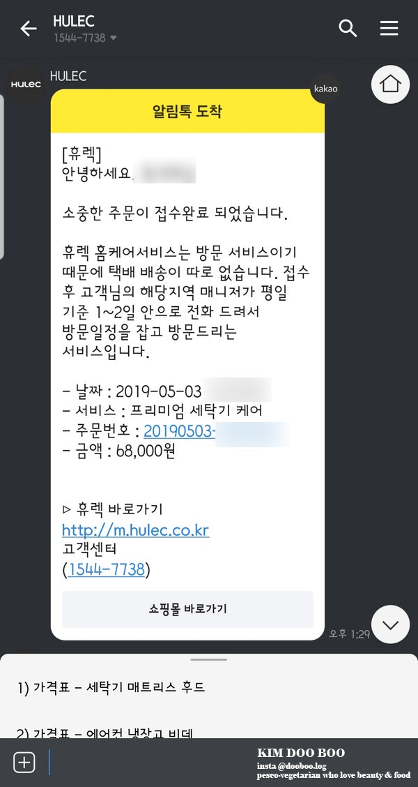 사이트가 있어서 등록했어요.여기서 내 집 세탁기에 맞는 사이즈를 찾아 단가표대로 결제할 수 있습니다.드럼세탁기 통세탁기 다 취급하고 있어서 kg 수만 보면 됩니다.가격은 다른 세탁업체에 비해 조금 저렴하거나 비슷한 수준이었습니다.제가 알아본 곳 중에는 이보다 비싼 곳도 있었고, 이 정도 업체도 많이 있었거든요.한 10만원 정도 불렀거든요.휴렉 사이트에서 세탁기 청소 결제를 하면 알림이 와요.내용은 해당 지역 매니저가 1~2영업일 이내에 예약전화를 한다는 내용입니다.