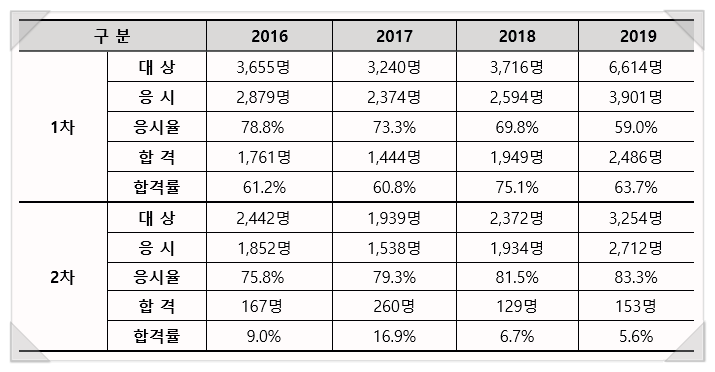 1차 시험은 객관식인데 합격률이 70%에 육박할 정도로 무난한 편이라 2~3개월 잘 준비하면 합격할 수 있습니다.