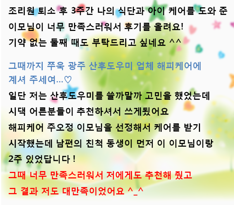 毎日私の状況を細かく管理してくださって色々とおしゃべりもしながらきちんとした産後ケア期間を過ごしながらたくさん回復することができました。 感謝の気持ちを込めて、最後のサービスを終えて帰る日には私の心のこもった手紙とプレゼントを差し上げて涙も流しました。~~ハッピーケアのカン·ミヨン管理士のおばさんは本当に最高でした。 いつも幸せで元気でいてください。ありがとうございます。