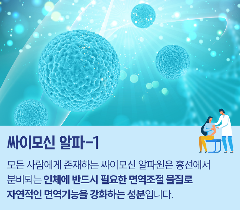 사이모신 알파1(알파원)은 28개의 아미노산으로 이루어진 면역조절 펩타이드입니다. 우리 신체 가슴 중앙부에 위치한 ‘가슴샘’에서는 체내 면역체계를 향상시키는 물질을 생성하는데 면역조절작용이 가장 뛰어난 물질이 사이모신 알파1(알파원)입니다. 사이모신 알파1(알파원)의 효과는?