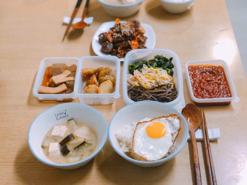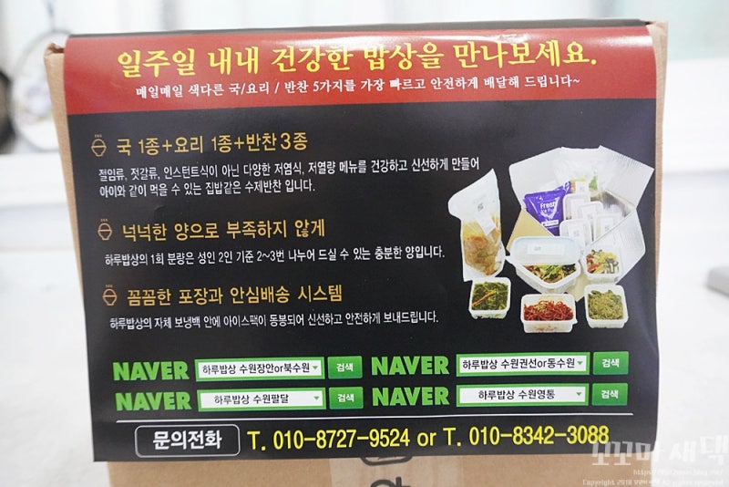 하루의 식탁은 매일 아침 5시경 현관 앞으로 무료로 배송해 주기 때문에 아침 식사로도 먹기 좋았다. 박스에는 아이스팩 대신 얼린 생수 2병과 반찬, 국이 들어 있었다.