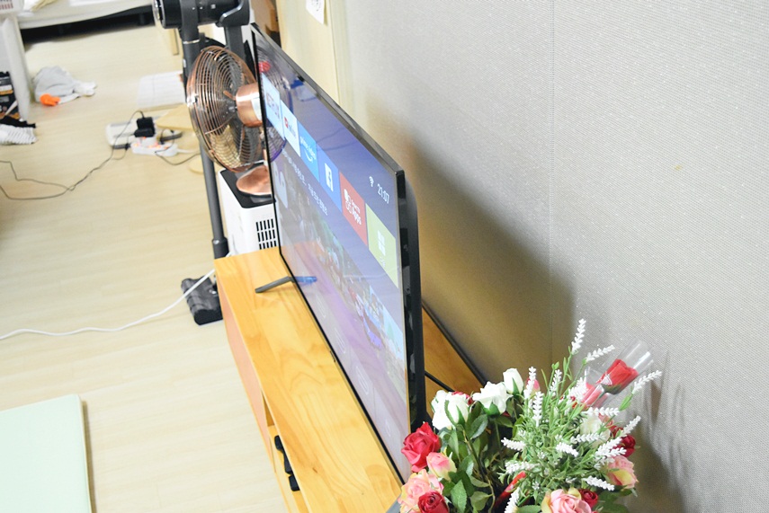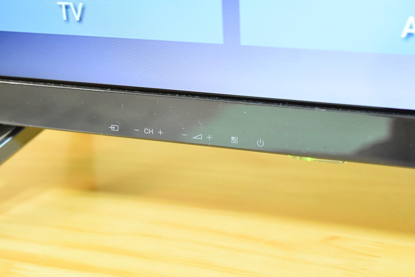 43인치 TV에도 다리를 튼튼하게 연결해 유격이나 흔들림이 전혀 없었고 하단에는 볼륨과 함께 전원 버튼이 위치해 있었습니다.