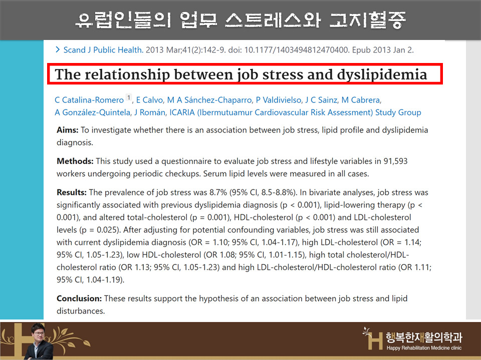 유럽인 연구에서도 업무 스트레스는 총 콜레스테롤, LDL을 높이고 HDL은 낮아져 고지혈증과 관련이 있다.