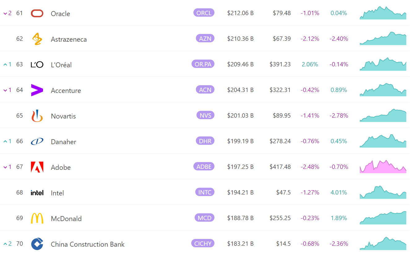 글로벌 시가총액 순위인데요. 참고로 주가 흐름을 보면 녹색이 상향이고 빨간색은 하향입니다. 미국은 한국이랑 다르죠?11위~20위입니다.여기서는 중국은 물론 한국도 보이네요.