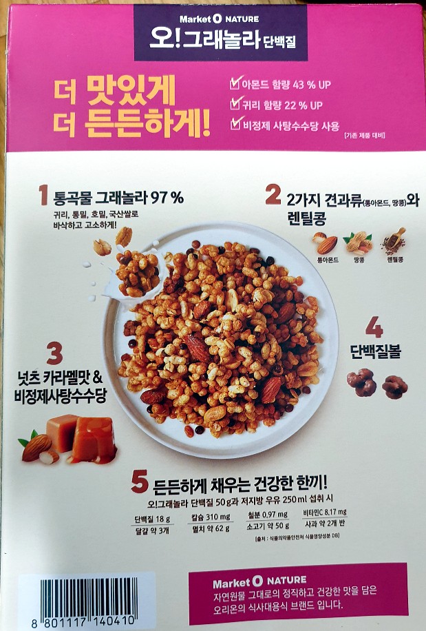 ·오! 그래놀라 단백질, 견과류 카라멜 맛 : 마켓오의 비교적 까칠까칠한 식감입니다.렌즈 콩, 아몬드, 땅콩, 귀리, 호밀, 쌀이 주원료라고 할 수 있습니다.