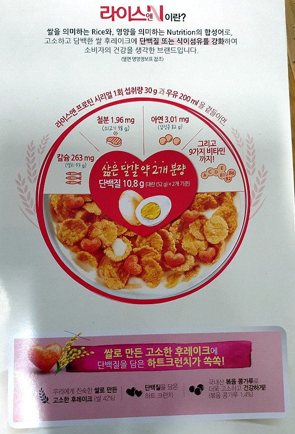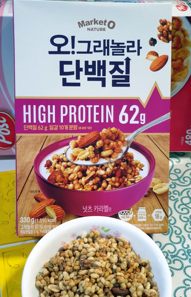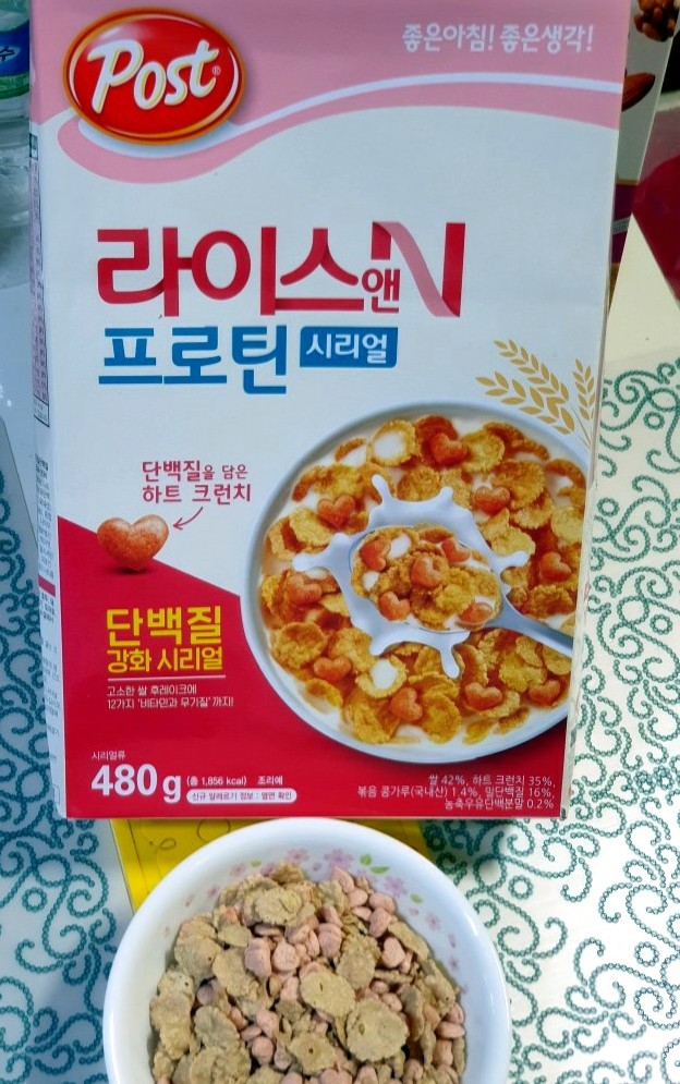 ·밥&프로틴: 포스트도 쫄깃한 식감입니다. 쌀, 볶은 콩가루, 밀, 우유분말, 옥수수 등이 주원료로 단백질과 12가지 비타민과 무기질의 영양성분을 갖춘 시리얼입니다.