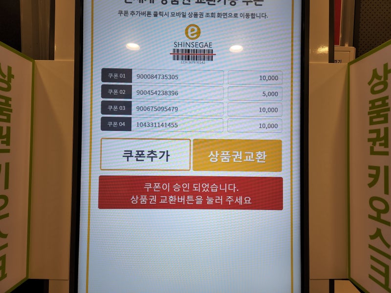 키오스크 단말기 하단에 있는 바코드에 기프티 컨버터 코드를 살짝 스캔해주시면 자동으로 쿠폰번호가 입력됩니다.바코드가 인식되지 않으면 손으로 바코드 아래 번호를 입력하시고 승인 요청을 누르셔도 됩니다.이렇게 하나의 기프티콘 쿠폰이 승인이 되고 저처럼 여러 개의 기프티콘을 가지고 계신 분은 쿠폰 추가를 눌러 다른 쿠폰까지 승인을 요청해 줍니다.내가 가지고 있던 4개의 기프티콘을 모두 바코드 스캔 완료했습니다.금액이 맞는지 확인 후 상품권 교환 버튼 누르겠습니다.그러면 아래 상품권, 영수증이 나오는 곳에 기프트권 금액만큼 상품권이 나옵니다. 완전간단!! 고객센터에서 굳이 기다리지 않으셔도 편하게 상품권 교환이 가능합니다.가지고 있던 기프티콘 총 4장, 이마트 신세계상품권 3만5천원어치를 간편하게 키오스크를 통해 지류상품권으로 교환 완료했습니다.상품권도 생겼겠다. 이마트 트레이더스 온 김에 쇼핑도 하고 갈게요.상품권 교환하러 와서… 가지고 있는 상품권 이상의 금액을 사버렸네요.배보다 배꼽이 큰 느낌이에요? 저뿐만이 아니죠…? 이상 신세계 이마트 모바일 상품권 키오스크를 통해 교환하는 방법이었습니다.이마트트레이더스송림점 인천광역시 동구 봉수대로 82 이마트트레이더스송림점이마트트레이더스송림점 인천광역시 동구 봉수대로 82 이마트트레이더스송림점이마트트레이더스송림점 인천광역시 동구 봉수대로 82 이마트트레이더스송림점