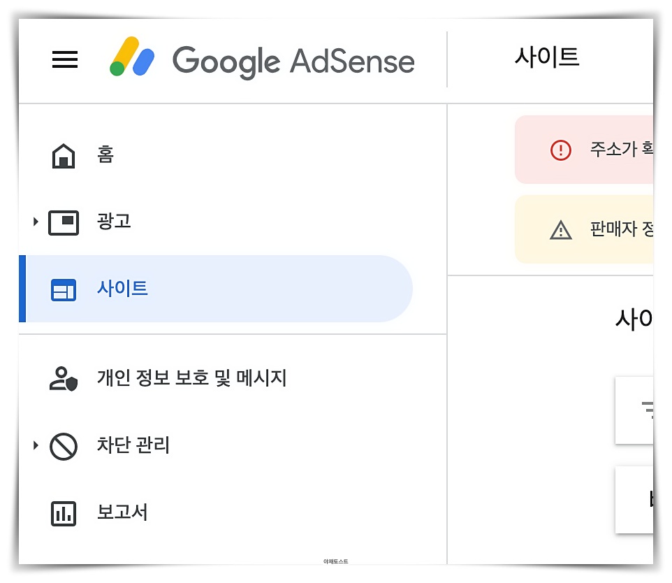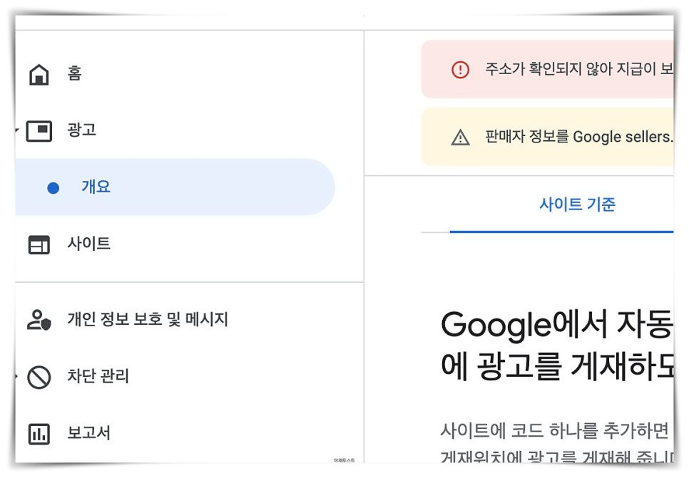 애드센스 메인 창에서 왼쪽 카테고리의 [개요]를 누르세요.