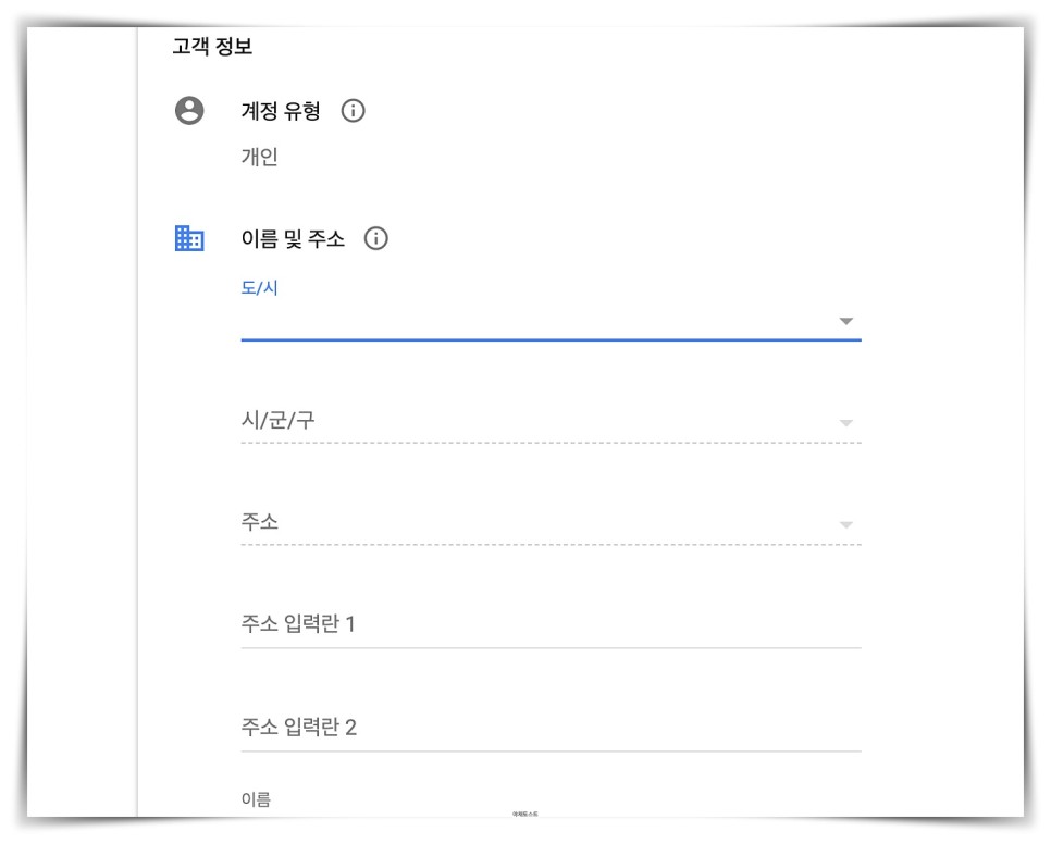 계정 유형을 선택하고 이름과 주소를 입력한 후 전화번호로 인증하는 역할까지 마치면 입력 정보가 종료됩니다.