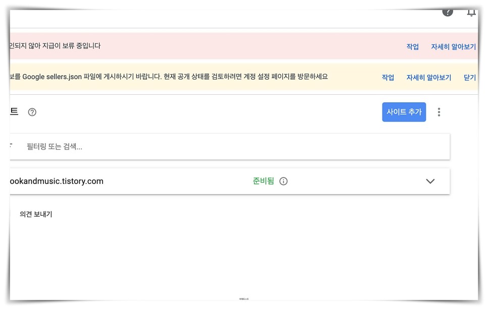 누르면 이런 화면이 보일 거예요.「준비중」이라고 하는 것은 구글에서 나의 블로그에 어드센스를 붙여도 되는지 검사중입니다.