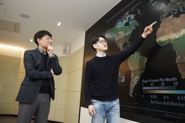 이명인 울산과학기술원 교수(왼쪽)와 서은교 조지메이슨대 연구원이 인공위성 토양 수분 자료를 분석하고 있다. 울산과학기술원이 제공한 인공위성 관측에 시뮬레이션을 결합해 지구 곳곳의 가뭄을 감시하는 기술이 개발됐다.