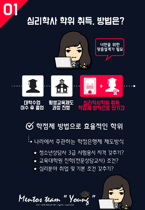 일반적으로 우리가 알고 있는 정규 대학의 학위 취득 기간은 4년제의 경우, 4년 2년제의 경우 2년입니까? 이는 정규대학이 일정 학년을 이수해야만 학위 취득을 할 수 있는 학년제 과정으로 구성되어 있기 때문입니다! 반면 학점은행제 심리학과 과정은 일정 학점만 이수하면 졸업장을 딸 수 있도록 되어 있습니다. 여기에 학점 인정 자격증과 독학 학위제라는 제도를 통해 학위 취득 기간을 단축할 수 있다는 사실! 자세한 기간은 전문가와의 1:1 멘토링을 통해 해결할 수 있습니다~