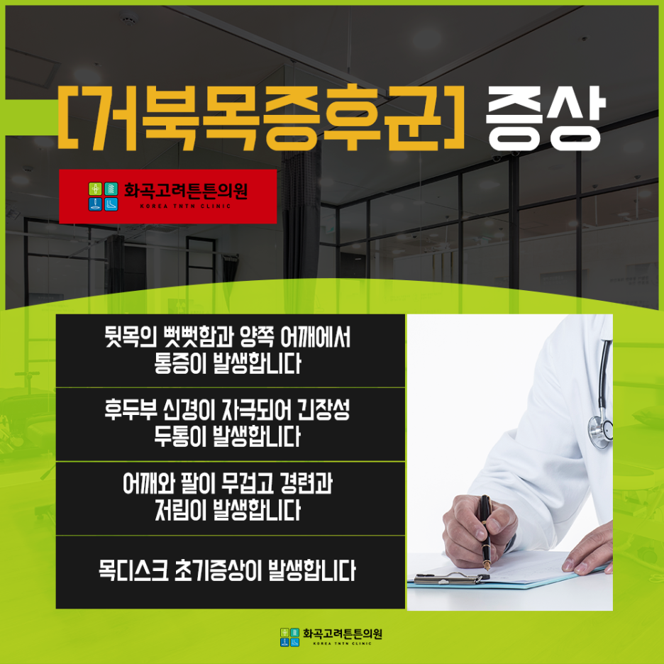위에서 설명한 바와 같이 목덜미의 근육을 상습적으로 긴장 상태로 만들기 때문에 근막동통 증후군이나 경추성 두통의 원인이 됩니다. 반대로 목 디스크가 심해서 거북목증후군이 되는 경우도 있는데, 화곡역 정형외과는 주변에서 목이 비뚤어진다고 하면 일단 거북목증후군을 의심해 봐야 하므로 기본적인 진단을 받는 것이 바람직합니다.