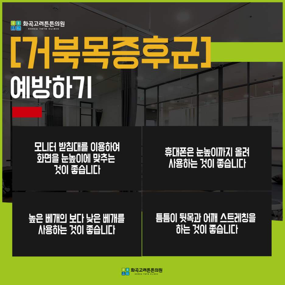 바른 자세가 곧 최고의 예방법입니다 그러나 자신의 의지와는 상관없이 주변 환경에 많은 영향을 받을 수 있는데 딱정벌레 증후군 유발 요소를 제거해야 합니다. 대표적인 것은 컴퓨터 모니터의 높이를 내 눈높이에 맞추고 책상 주변 모니터의 높이를 조절하는 것인데, 이러한 개선은 목과 어깨의 긴장을 푸는 데 큰 도움이 됩니다.