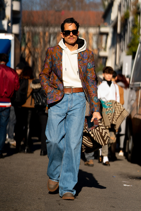 자켓과 매치한 데님 팬츠는 허벅지에서 밑단으로 갈수록 품이 좁아지는 테이퍼드 실루엣을 선택하시면 됩니다.테이퍼드(tapered) ‘끝이 가늘어졌다’는 뜻으로 옷자락을 향해 가늘어진 형태입니다.