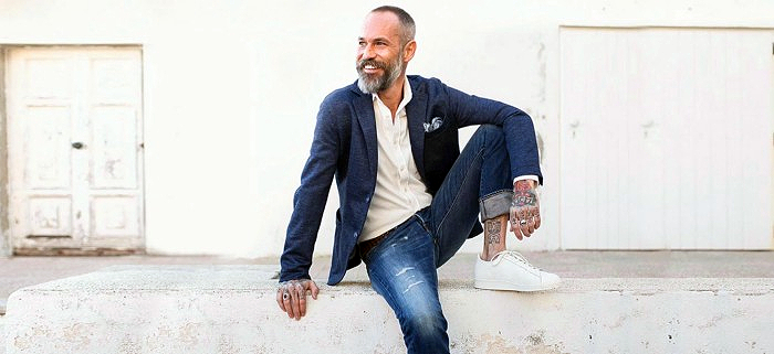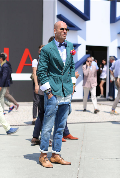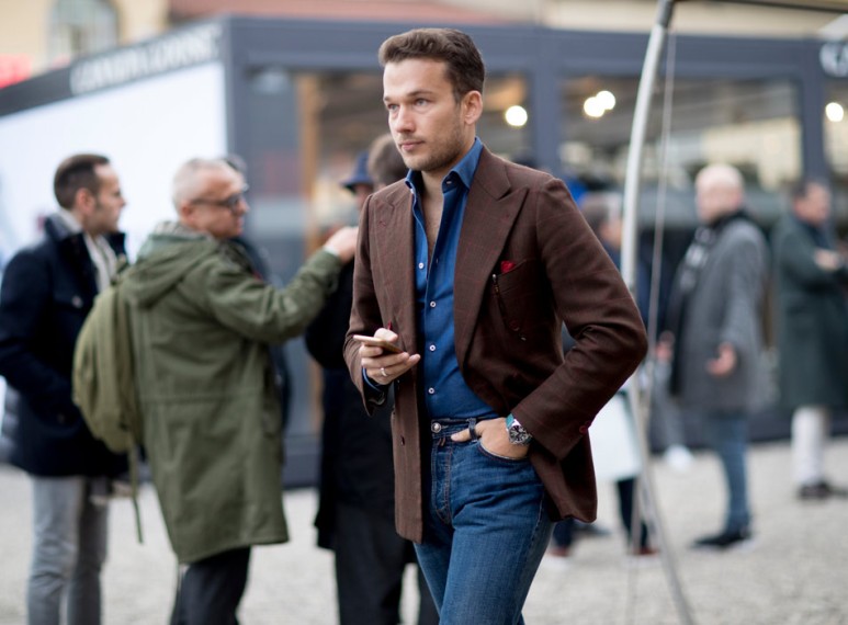 몸에 꼭 끼는 데님 팬츠는 중년 남성의 품위를 떨어뜨릴 수 있다.