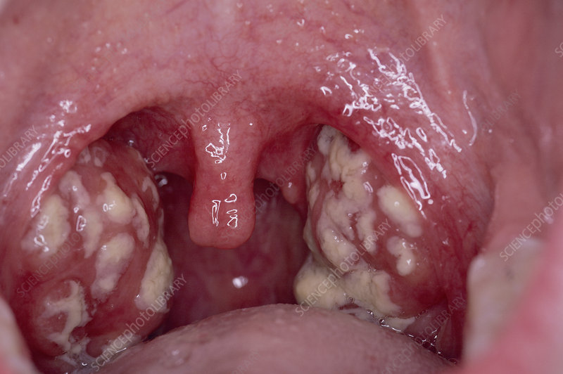 그런 상태에서 몸이 좀 이상하고 면역력이 떨어지면 세균이 번식해 다음 사진처럼 급성 편도염을 일으키게 되는 것이다. 사진에 나타난 하얀 덩어리는 세균 덩어리와 침, 그리고 염증에 의해 분비되는 삼출액이 섞여 편도 표면을 덮고 있는 것이다. 보통 목이 부었어요.라고 증상을 호소할 때 이런 사진과 같은 전형적인 편도선을 보고 급성 편도염이라고 진단하게 된다.