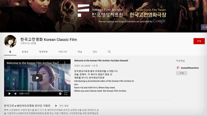 한국고전영화 Korean Classic Film 한국영상자료원 유튜브 채널에 오신 것을 환영합니다. 이곳에서 무료로 190편 이상의 한국영화를 관람하실 수 있습니다. 더 많은 한국영화를 보고 싶다면 한국영상자료원 KMDB http://www.kmdb.or.kr를 방문해주세요. Welcome to the Korean Film Archive YouTube Channel. Here you will find 190 classic Korean films from the 1930sonwards available for free Viewing. If you are interested … www.youtube.com