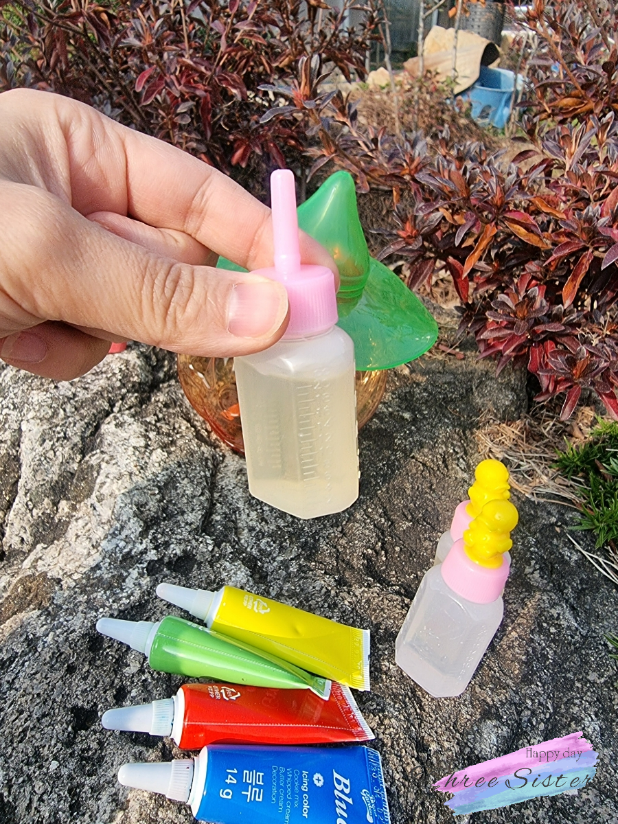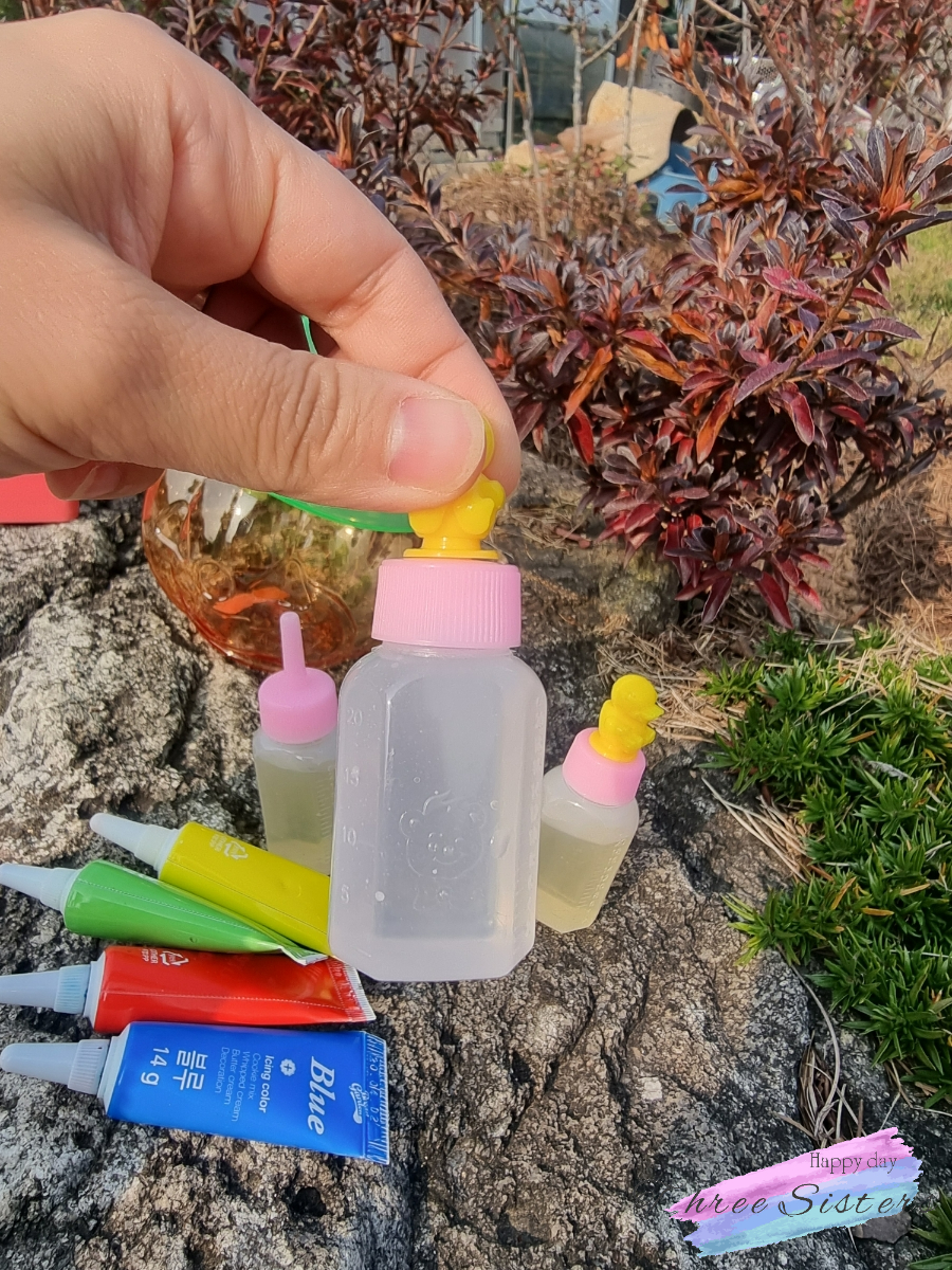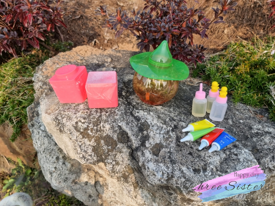 분홍색 통은 베이킹 소다와 구연산이에요~~작은 약병에서 담아온 건 식초와 물 두 가지 액체예요~물약에 색을 내기 위해 식용 색소도 준비해봤어요^^