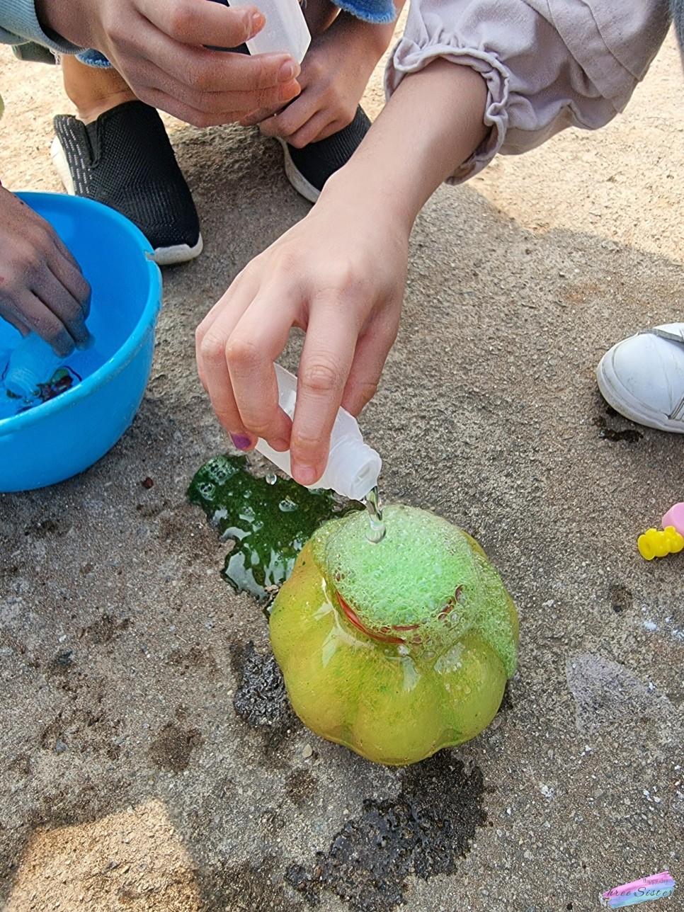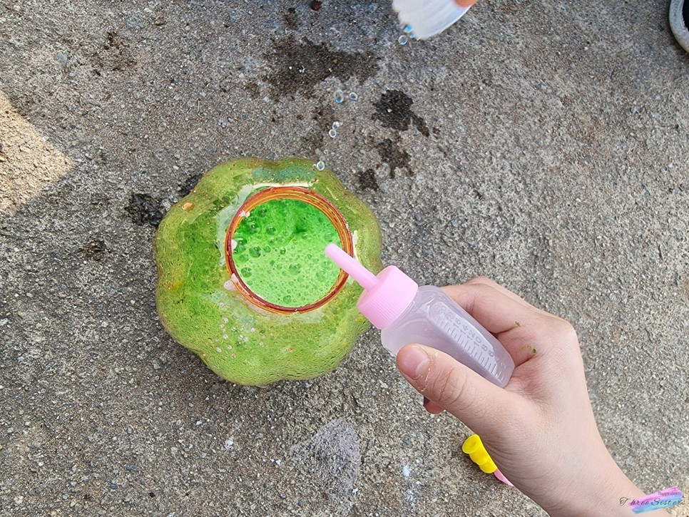 실험을 할 때에는 두 가지 방법 모두 반응도 잘 일어나고 아이들 눈에도 좋아요~~ 다만!식초를 사용하면 식초 냄새가 나기 때문에 가능하면 베이킹소다와 구연산의 조합을 추천합니다.^^