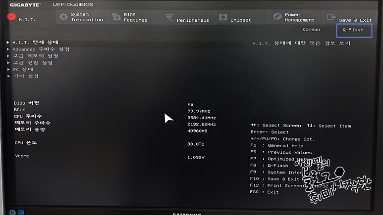 기가바이트 바이오스에 진입할 경우 다른 것은 아무것도 손대지 않고 Q-Flash(오른쪽 상단, 파란색 상자로 표시함) 메뉴를 클릭합니다. 메인보드의 주요 제조사답게 바이오스 업데이트를 할 때도 몇 번 클릭하지 않아도 되게 잘 꾸며놨어요.