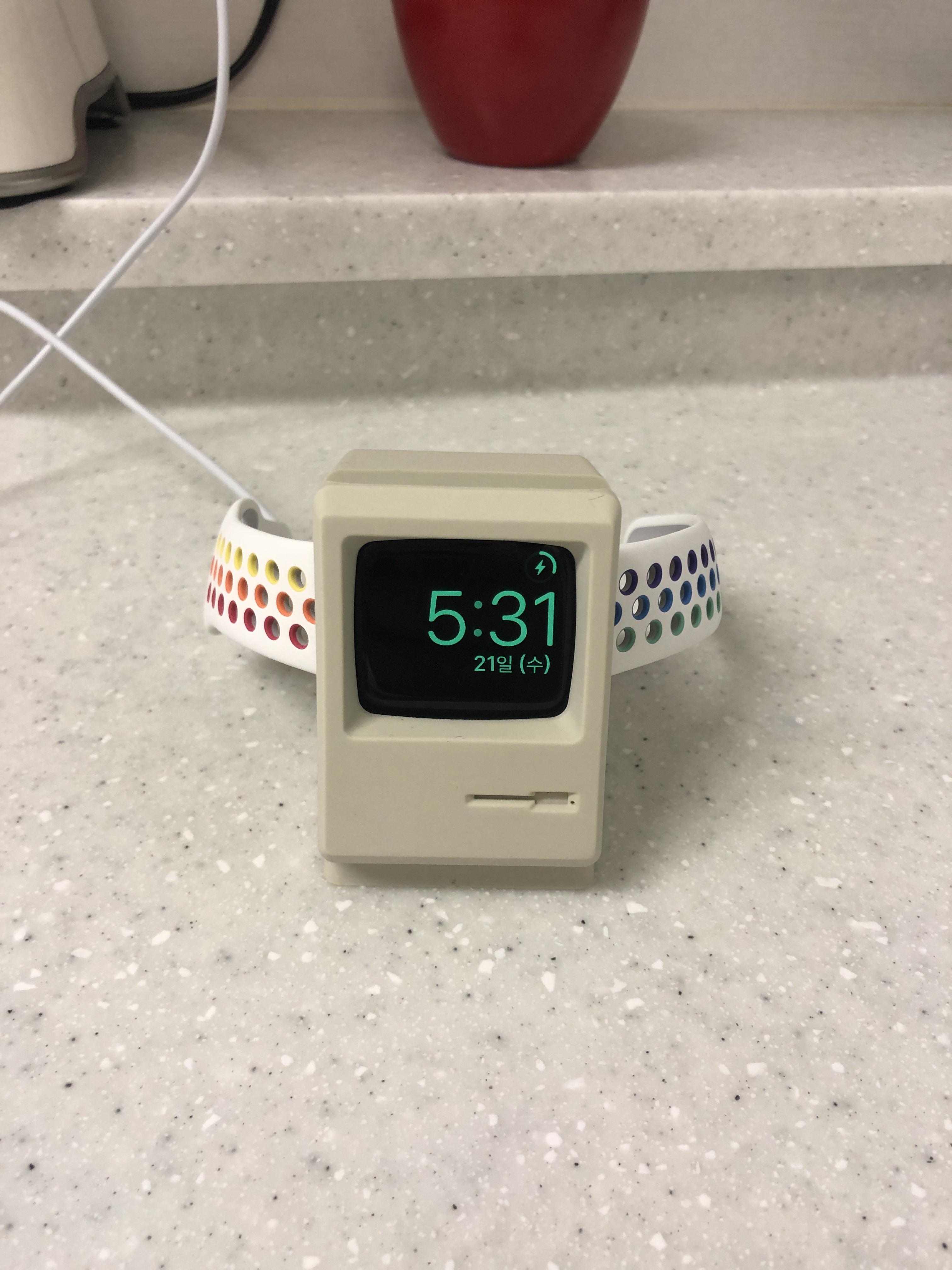 내가 에라고 애플워치 스탠드를 구입한 이유는 여러 가지가 있는데, 가장 큰 이유는 바로 이 모습 때문입니다.지난 번에도 투고했지만 애플 워치에는 충전 모드인 탁상 시계 모드가 있습니다.이 모드를 활성화해 두면 충전 중에 탁상 시계 워치 페이스가 보입니다.이게 매킨토시 스탠드랑 찰떡궁합이에요.폰트하고 컬러하고 진짜 매킨토시 같지 않아요?다양한 스탠드가 있지만 가장 어울리는 스탠드가 에라고 애플워치 스탠드라고 생각합니다. 끝내고…이번에는 에라고 애플워치 스탠드를 사용해봤습니다.구입 전 팔에 착용하는 시간보다 거치해 두는 시간이 많지 않을까 걱정했지만 현실이 되어버렸습니다.팔에 있는 것보다 올려놓는 게 더 예쁠 것 같아요.사실 에어팟도 케이스가 너무 예뻐서 케이스를 먼저 사고 에어팟을 샀는데 이번에도 비슷하네요.애플정품 충전케이블로 충전시 불편함을 느끼신 분들은 꼭 구입하시길 권하고 싶은 제품입니다.퀄리티도 퀄리티인데 에라고는 정말 창의성이 넘치는 제품들로 넘쳐나는 것 같아요.아마 앞으로 대부분의 케이스나 거치대는 에라고 제품을 사용하지 않을까 생각합니다.#애플워치거치대 #애플워치충전기거치대