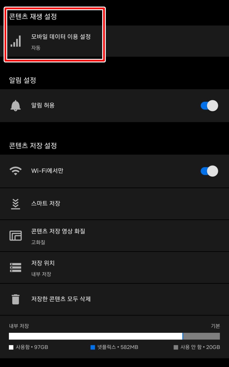앱 설정에서는 모바일 데이터 사용 제한이 가능하며, 오프라인 저장 관련 설정도 가능합니다.