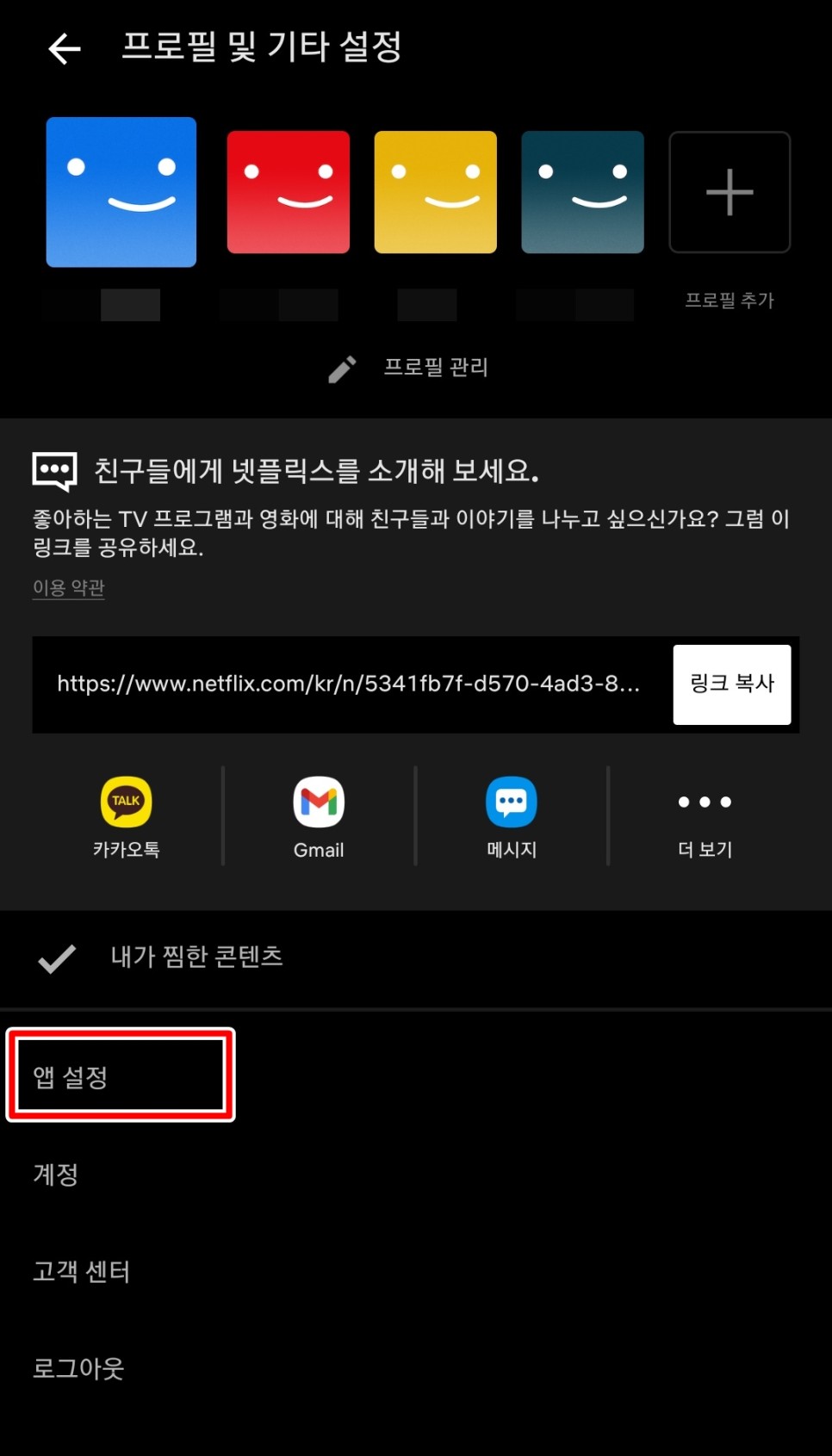화질 설정시와 같이 메인 화면에서 프로필 아이콘을 클릭하고, 앱 설정을 클릭합니다.