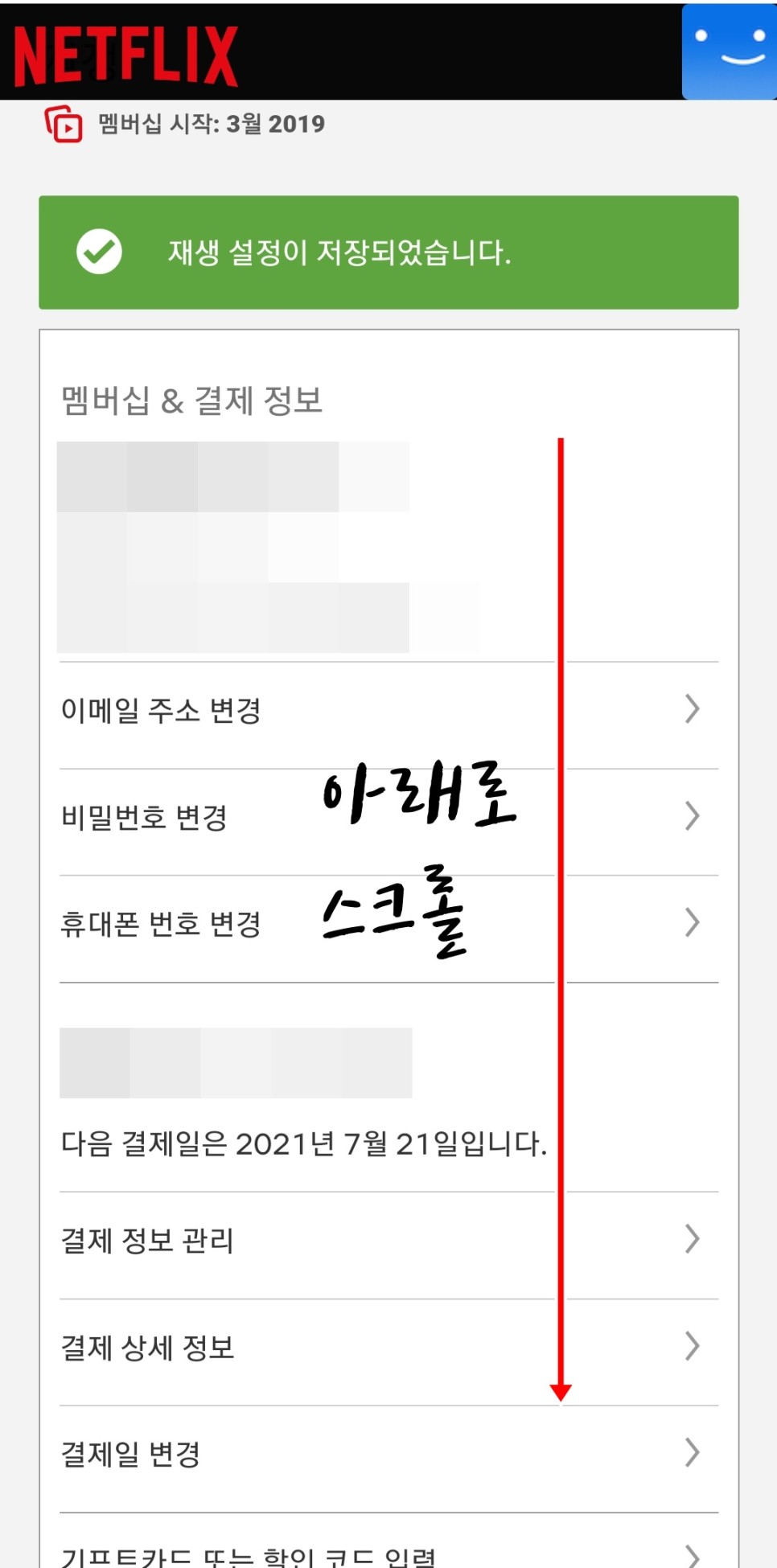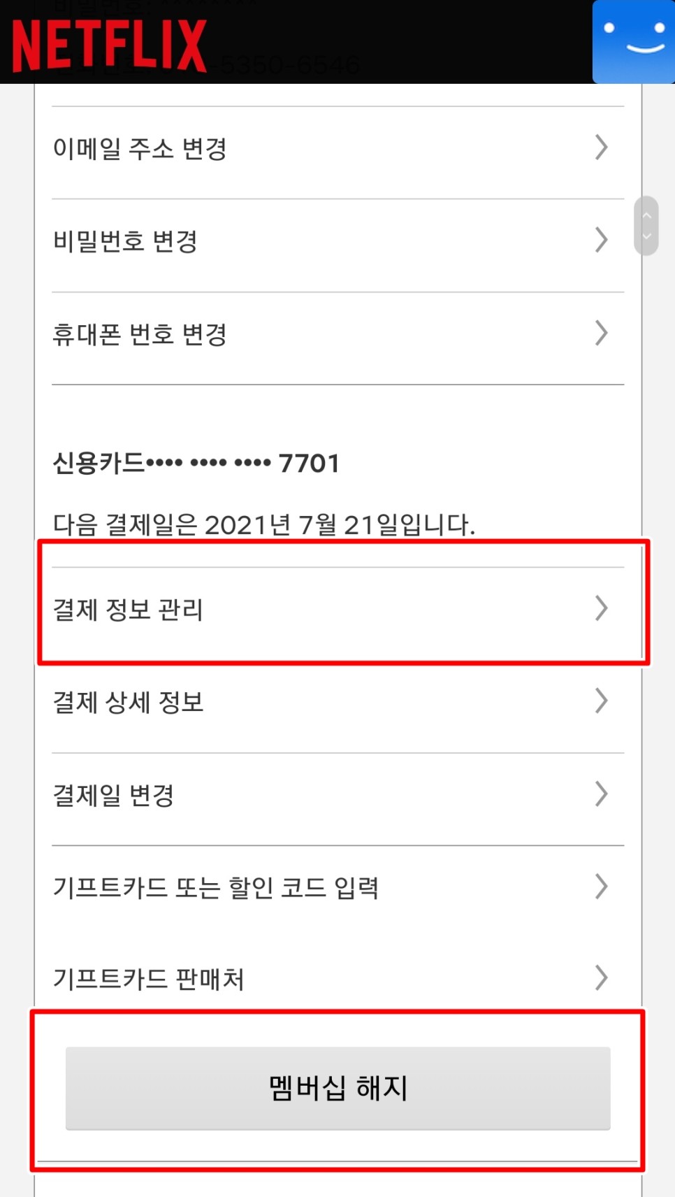 계정 버튼을 클릭하시면 바로 멤버십 해지 및 결제정보 관리가 나타납니다.