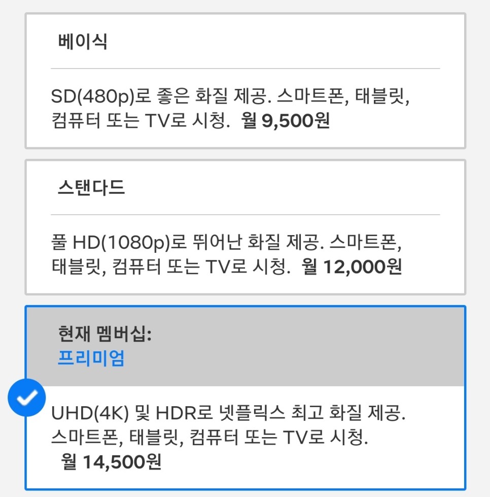 다만 저처럼 화질을 중시하거나 가족 단위로 함께 사용하거나 하는 분은 프리미엄 요금제를 사용하는 것이 가장 베스트라고 생각합니다.