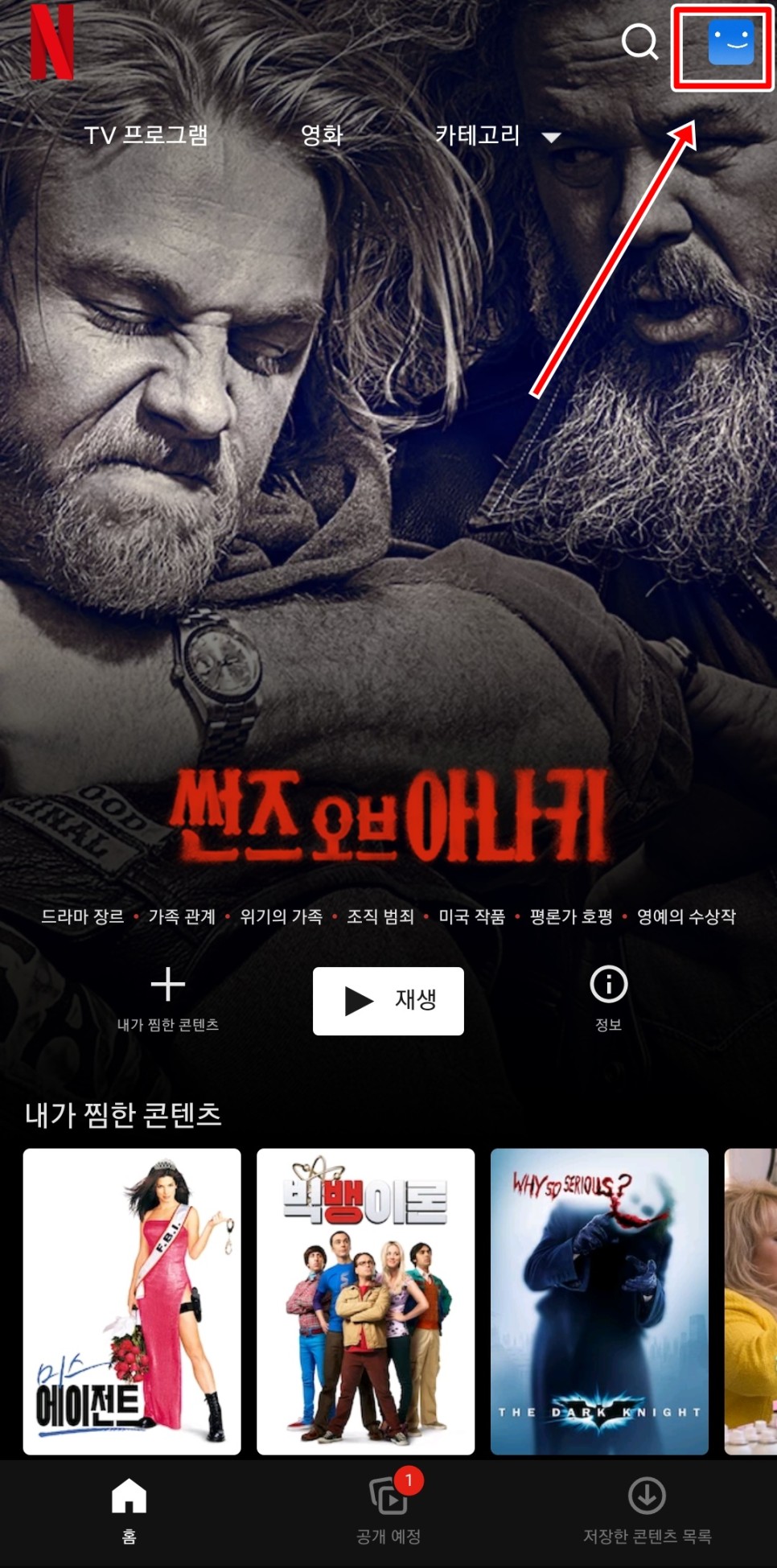 넷플릭스 앱 메인 화면에서 우측 상단의 프로필 아이콘을 클릭해 주세요.