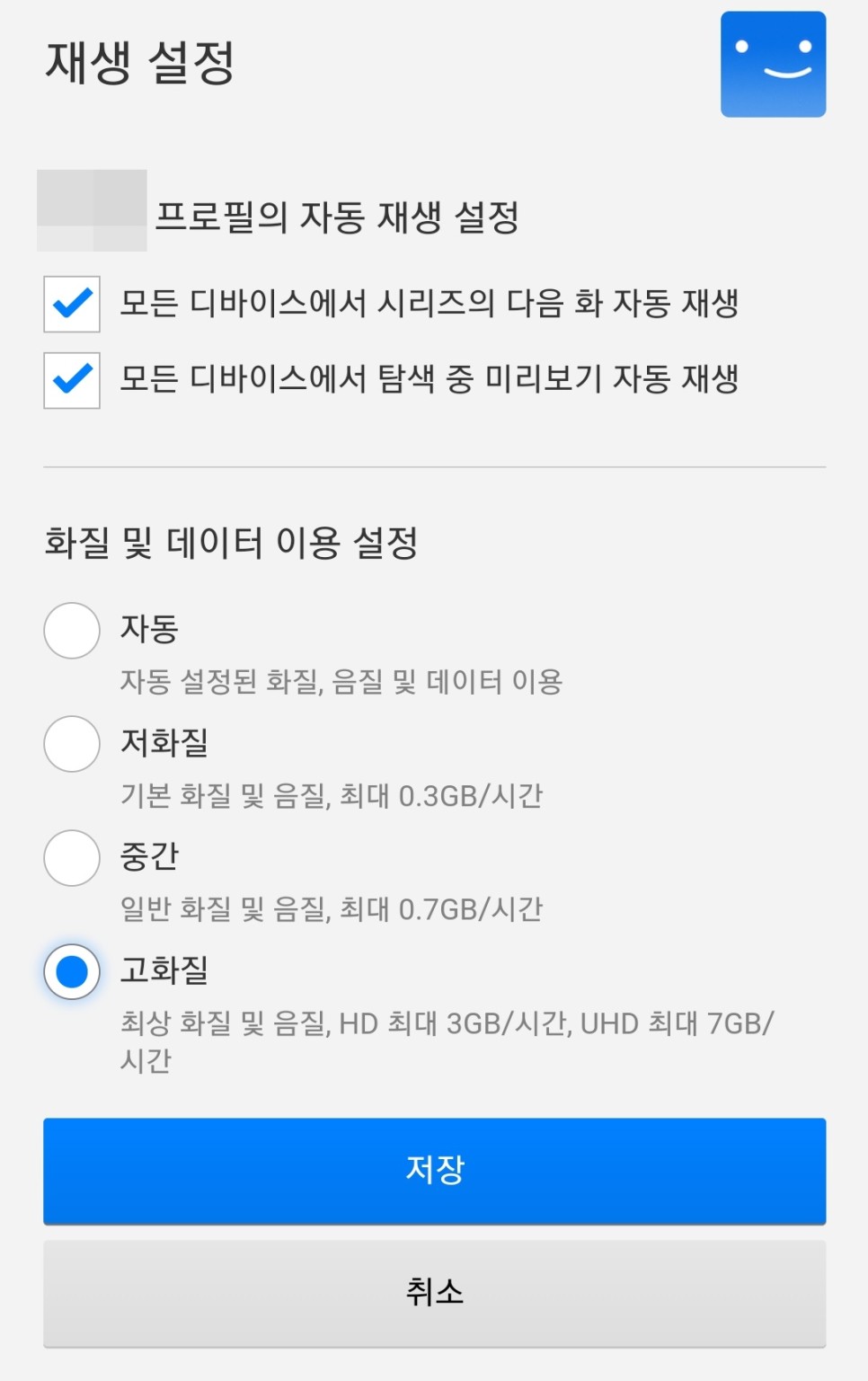 재생 설정을 누르면 화질 설정이 가능합니다.다만 최고화질은 요금제의 종류나 시청하는 기기나 인터넷 연결 상태에 따라 지원 여부가 갈립니다.