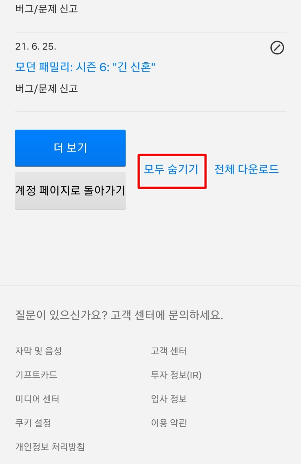 모든 기록을 삭제하고 싶을 때는 아래를 향해 스크롤하여 모두 숨기기를 클릭하면 모든 시청 기록이 삭제됩니다.