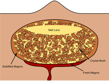 ★ 단순화된 현대적인 마그마 구조모식도 ◆ 마그마를 포함한 관입체(intrusive body)는 중심을 이루는 덩어리가 있으며 그 아래에 마그마 물질을 공급하는 공급맥(feeder-dykes)이 발달되어 있다.•마그마 덩어리 위에는 화산활동 등을 일으키는 관입암맥이 발달해 있다·보통 마그마는 한 깊이에 덩어리가 하나 존재하는 것이 아니라 여러 개의 깊이에 여러 덩어리가 놓여져 서로 연결된 구조로 여겨지고 있다.·이 깊이 분포는 밀도와 관련하여 마그마의 분화 정도에 따라 마그마 밀도가 달라지므로 그 깊이 역시 나뉜다.◆마그마의 중요한 특성은, 흐르고 관입을 일으키거나 분출하거나 할 수 있는 퍼텐셜이다.•그러나 마그마가 한 번 쌓이면 주위에 열을 잃으면서 내부 구조는 균질해지지 않는다.•주변에는 끊임없이 지각물질과 성분교환이 일어나 열이 발산되며 관입체 주변부 대부분은 용융물(melt)보다는 고체상의 광물이 더 많은 상태로 존재한다.다양한 실험과 계산은 약 5060%의 부피가 고체 결정으로 구성되면 급격한 점성 증가가 일어나 사실상 흐르지 않는다는 것을 보여준다.•약 60% 이상의 광물결정이 부피를 차지하면 광물은 서로 얽히면서 일종의 그물을 만들고 용융물은 그 틈새 공간에 분포하는 구조로 변화한다.따라서 이들은 이제 마그마가 아니라 대신 결정죽(crystal mush)이라고 부르게 된다.•결정사한 후에 열을 더 잃어, 마침내 굳어 심성암이 된다.결정죽보다 고온으로 광물이 반이하를 차지하고 있는 것이 마그마이다.보통 이 마그마는 넓고 넓은 결정대나무 속에 얇은 렌즈 형태로 존재하며 이 구조를 특히 용융물 렌즈(meltlens)라고 한다.•그러나 이 결정죽에 있는 용융물도 나름대로 흘러 마그마와 접하고 있기 때문에 마그마와 성분 및 물질교환을 활발히 하고 있는 것으로 보인다.용융물만 반응하는 것이 아니라 결정죽으로부터 광물의 결정이 마그마에 유입하거나 그 반대도 일어난다.용융물 렌즈는 큰 결정 대나무의 덩어리안에 몇개인가 놓여져 있을 가능성도 있어, 새롭게 유입된 현무암질 렌즈와 길게 분화해 상부에 머무르는 분화 렌즈가 복합적으로 놓여져 있는 것도 가능하다.위쪽 렌즈의 경우 마그마 속의 기체가 위쪽 분리되면서 위쪽 기체가 굳어 있는 층이 분리돼 존재하기도 하는데 이는 나중에 화산 분출의 원동력이 되기도 한다.◆때문에, 지구 물리 탐사로 밝혀내는 큰 저속도층은 그 모두가 마그마가 아니고, 사실은 결정죽과 마그마 양쪽이 포함되는 하나의 덩어리이다.· 결정죽의 부피는 마그마의 것보다 훨씬 크고, 수~수십배로 여겨진다.·그래서, 지구 물리 탐사를 통해서 큰 규모의 저속도층이 발견되어도, 대부분은 분출 가능성이 부족한 결정 죽이기 때문에, 그 안에 훨씬 소규모의 마그마가 렌즈상에 들어가 있는 것이 된다.•이러한 화산 아래 마그마와 결정죽의 부피는 대충 알 수 있지만 그 안에 분출 가능한 용융물의 양은 쉽게 추산할 수 없다.결정죽의 공극률등의 구체적인 물리 정보는 정확하게 얻기 어렵기 때문이다.◈5마그마의 분포◆맨틀 항목에도 잠깐 설명돼 있지만 지구 내부는 (외핵을 제외하면) 모두 고체 상태인 것이 기본이다.연약권의 부분 용융 상태라고 하는 것도 기껏 녹아도 1%가 될까 말까다.•마그마 및 마그마 주변의 구조는 오늘날 관찰된 최대 규모라 해도 수백 킬로미터 정도이며 존재 깊이도 깊고 상부 맨틀의 상부에 존재하는 것으로 대부분의 마그마는 200 km 보다 얕은 곳에 위치하고 있다.간혹 플룸 구조론을 설명하면서 시뻘건 덩어리나 흐름이 맨틀 깊은 곳에서 솟구치는 듯한 묘사가 나오는데 여기서 말하는 흐름은 고체의 흐름이다.뜨거운 플룸의 상승도 마그마 자체는 200300km이내에서 관찰된다.그 때문에, 지구 내부는 거의 전부 고체로 되어 있어 마그마 덩어리가 가끔 박혀 있는 정도다.◈6판 구조에서의 역할◆마그마는 화성 활동 그 자체라고 할 수 있다.마그마의 형성과 이동, 정치(emplacement)와 냉각은 지구가 오랜 시간에 걸쳐 층상화 되는데 가장 중요한 역할을 한다.•즉 마그마가 만들어지고 분출되는 과정을 통해 대륙이 성장하고 섬이 만들어진다.•대기권 또한 지구층 구조의 일부로, 지구 내부에 갇힌 기체상을 대기권으로 「분리」시키는 것도 마그마로 대변되는 화성 활동이다.또, 다량의 열을 효과적으로 지표로 옮기기 위해, 지구가 식어 가는 과정의 중요한 메카니즘이다.뿐만 아니라, 섭입대로부터 맨틀안에 침강 하는 물질을 다시 지표로 운송해, 물질 순환을 일으키는 주된 경로로서 작용한다.◆단단한 마그마는 통상응력장에 대하여 견고하게 행동하므로 경우에 따라서는 판의 결합(suture)에 중요한 역할을 할 수 있다.실제로 판이 찢어지면 화성암이 많이 들어가 있는 곳은 응력장에 대해 딱딱하게 굳어 찢어지지 않도록 하는 성질을 지닌다.동시에 판이 찢어지는 곳, 즉 열곡이 생기는 자리는 마그마가 만들어짐으로써 응력장을 크게 낮춰 열곡대가 잘 펴지도록 해준다.◈7관련용어 7.1 용암(lava):◆마그마는 화산이 분출하기 전에 지하에 놓여 있을 때의 상태를 지시한다.한편 용암은 마그마 물질이 지표로 분출되었