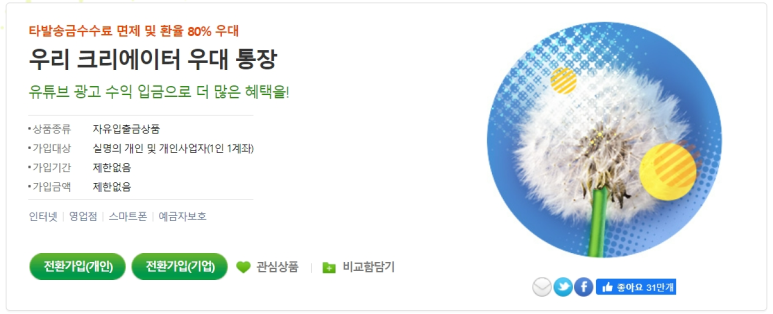 저희 크리에이터 상품에 대한 자세한 설명은 은행 사이트에 있으니 링크를 걸어둘게요. https://spot.wooribank.com/pot/Dream?withyou=PODEP0019&PRD_CD=P010002429&PRD_YN=Y&cc=c007095%3Ac009166%3Bc012263%3Ac012399