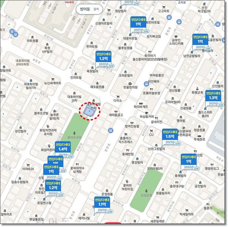 울산 동구 방어동 1160-4, 혜인골든비취빌딩[A동/24평/4층] – 전용면적 : 73.68㎡(24평) – 대지권 : 40.07㎡(12.12평) – 구조 : 방3, 욕실2, 거실, 주방.레스토랑, 발코니 등 – 총4층중 4층, 남향 – 사용승인일 : 1997년 8월 – 가구수 : 8가구(총1동) 21~22년 인근 거래내역본건 주변 평형대와 비슷한 빌라 물건의 거래 내역을 골라봤습니다. 대략 1억~1억5천대에 거래되었습니다. 자세히보기화암초등학교 서쪽에 소재하며 주변은 상가, 학교, 단독주택, 공동주택(문현아이파크, 현대비치, 꽃바위현대) 등으로 형성된 주거지입니다.주요 편의시설은 하나로마트 방어점(1.3km), 홈플러스 동구점(2.2km), 울산대학교병원(4.3km), 꽃바우공원, 삼도공원, 울산동부소방서, 문현시장 등이 소재하고 있습니다. 교육 시설은 성재어린이집, 화암자연과학유치원, 화암유치원, 화암초등학교, 화암중학교, 문현고등학교, 화암고등학교 등이 위치해 있습니다.올해 25년 정도의 다가구 주택입니다. 방어동 내 생활권에 무난한 입지로 거주환경은 조용하고 조용한 분위기를 자랑합니다.도보권 내에 초·중·고가 있어 아이들의 등하교가 용이하며 서쪽에는 현대중공업 해양사업부가 있어 출·퇴근에 편리합니다.방어진 순환도로와 염포산 요금소가 인접해 있어 남구 중심권과 접근성이 뛰어나다.혜인골든비취빌딩A울산광역시 동구 화잠5길 69혜인골든비취빌딩A울산광역시 동구 화잠5길 69동구빌라진행물건2021 다경5371성진빌라 4층 26평형입니다.2021 다경111252수정아트빌 B동 1층 물건입니다.2021 다경 110914방어동 1014-3, 손두하이츠빌라 C동 27평형입니다.2021 다경8189전하동 651-4번지 산성연립 E동입니다. 2층 중 1층 동향 라인입니다.2021 다경6602마지막 물건은 원진아트빌 5차 25평형입니다.오늘은 울산 동구 빌라 경매 사건에 대해 알아봤습니다. 법무사 사무소와 협업하여 보다 정밀한 권리 분석과 보다 신속한 법률 자문이 가능합니다. 물건 의뢰 시 낙찰 1건을 보장하고 법원 입찰, 낙찰, 대출, 등기 연계 등의 업무를 원스톱으로 함께 진행합니다. 아래 밴드 가입 시 울산 전 지역 입찰 추천 매물을 보다 편리하게 조회할 수 있습니다.최 팀장 울산경매센터 | 반도울산경매물건컨설팅, 대행전문 band.us최 팀장 울산경매센터 | 반도울산경매물건컨설팅, 대행전문 band.us최 팀장 울산경매센터 | 반도울산경매물건컨설팅, 대행전문 band.us최 팀장 울산경매센터 | 반도울산경매물건컨설팅, 대행전문 band.us