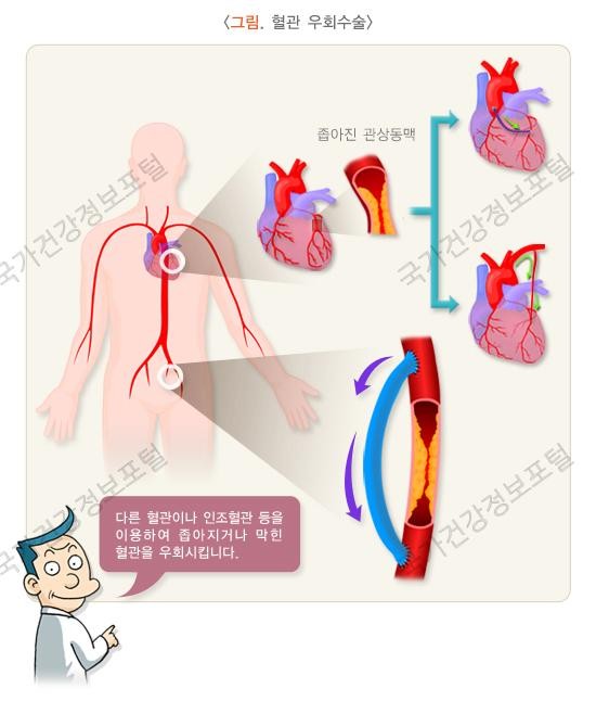 그러나 병이 너무 많거나 협착이 너무 길어 스텐트를 넣을 수 없거나 너무 딱딱해서 시술로는 도저히 열 수 없는 경우에는 우회 수술을 할 수 있습니다. 이것은 막힌 부위를 자신의 혈관을 떼어내 붙이거나 인공 혈관을 붙여 우회로를 만들어 피가 통하게 해주는 것입니다.