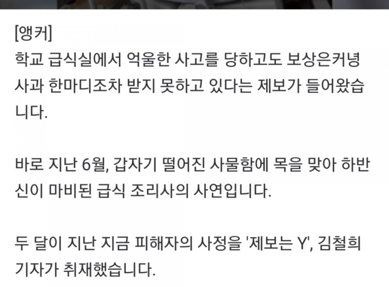 [앵커] 학교 급식실에서 사고를 당하고도 보상은커녕 사과 한마디 받지 못하고 있다는 제보가 있었습니다 지난 6월, 갑자기 떨어진 사물함이 목에 맞아 하반신이 마비된 급식 셰프 이야기입니다. naver.me