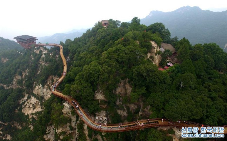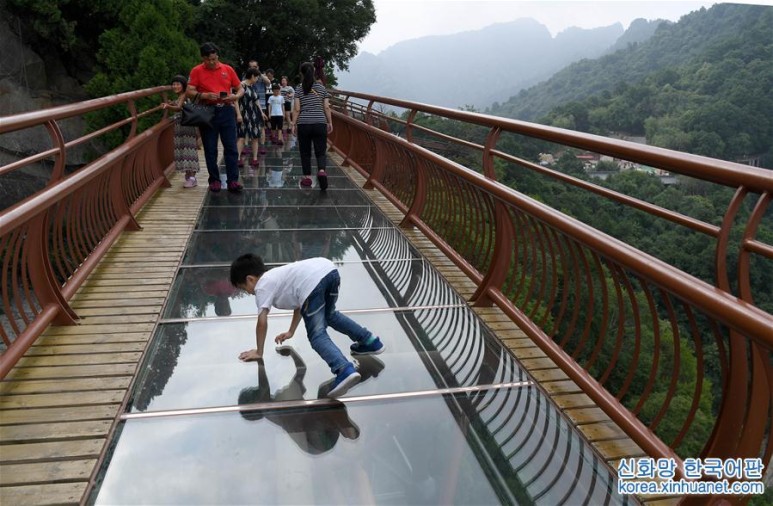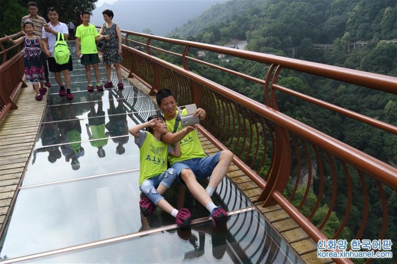 산시 성의 소화산 유리잔도 유람객들이 사오 화산 유리잔도에서 기념사진을 찍는다.한여름 들어 산시 성 샤오화 산 국가급 산림공원에는 유람객들로 가득하다.유람객들은 통유리창 밖의 아슬아슬한 체험을 즐긴다.사오화산잔도의 길이는 455m이고 그 중 유리잔도의 길이는 69m, 넓이는 2.5m이다.[촬영 / 신화사 기자 유효] 원문출처 : 신화사