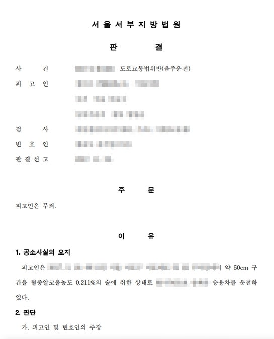 진술을 일관되게 하지 못하면 상황은 더 악화되기 때문에 신속히 변호사를 찾아가 구속수사를 면하면서 자신의 상황을 명확히 대변할 수 있어야 합니다. 본 혐의에 처했다면 음주운전 무죄를 주장하기 어렵지만 개개인이 처한 상황을 제대로 입증하고 변론할 수 있다면 처음부터 불가능하지 않습니다. 자신의 상황을 보다 법리적 관점에서 확인하면서 조력을 구하다 보면 원하는 결과에 직면하기도 하고 참작될 부분도 찾아 대응할 수 있습니다.음주운전 무죄사례 – 고의로 한 것이 아니므로관련 사례를 소개하자면 A씨는 지인들과 회식을 하게 되었고 평소보다 과음하여 만취상태가 되었습니다. 이후 A씨는 차에서 시동을 걸고 잠시 휴식을 취하고 잠이 들었고, 그 과정에서 기어를 만지며 주행모드로 바뀌면서 앞에 주차된 차량과 약간 충돌하고 말았습니다.해당 사고로 경찰까지 출동했고, 당시 A씨는 면허 취소 수준의 혈중 알코올 농도가 측정됐고, 이에 음주운전 재판까지 받게 됩니다. 곧 A씨는 변호사를 찾게 됐고 변호사는 사건을 면밀히 검토한 뒤 적당히 대처했습니다.우선 변호사는 A씨가 대리운전 기사를 부른 이력과 차량 블랙박스 및 주변 CCTV 영상 등을 확보했고, 이 같은 근거 자료를 통해 A씨가 대리운전 기사를 기다리는 동안 차량 내에서 잠든 것이지 고의로 운전한 것은 아니라고 주장했습니다. 이처럼 변호사의 적극적인 대처로 A씨가 운전하다 사고가 난 것을 인지하지 못했다는 점을 인정했고 법원은 A씨에게 음주운전 무죄를 선고했습니다. 이렇게 의도하지 않은 일로 입건됐다면 고민 없이 법적 조력을 통해 신속하게 처리할 수 있어야 합니다.골든타임 안에 해결하려면이렇게 초기 대처를 확실히 하면 최악은 피하고 더 나은 상황으로 만들 수 있지만 보통은 무서워서 하루 이틀 고민하다가 그 시기를 놓치기도 합니다. 운전하는 사람이라면 누구나 술의 위험성은 인지하고 있겠지만 만취 상태에서 무심코 습관적으로 운전대를 잡곤 합니다.그러나 자신의 오판으로 인해 사고가 발생하면 여러 피해가 지속될 수 있다는 점을 인지하고, 이는 분명히 중범죄이며 죄질이 무겁다는 점을 인지해야 합니다. 또한 단순 음주운전이 아닌 인명피해가 발생한 경우에는 더 중한 처벌이 내려지며, 최근에는 사고 없이 적발된 경우도 예외 없이 처벌됩니다.아울러 본 사안에서 재범의 실형 선고가 증가하는 추세이므로 음주운전 무죄를 주장하고자 하는 경우 증빙자료를 마련하여 철저한 대응을 하여야 합니다. 억울하게 혐의를 받더라도 예외 없이 골든타임을 놓쳐서는 안 되기 때문에 본 사건의 경험이 풍부한 곳에서 만족스러운 결과에 직면해 주시기 바랍니다.그러나 자신의 오판으로 인해 사고가 발생하면 여러 피해가 지속될 수 있다는 점을 인지하고, 이는 분명히 중범죄이며 죄질이 무겁다는 점을 인지해야 합니다. 또한 단순 음주운전이 아닌 인명피해가 발생한 경우에는 더 중한 처벌이 내려지며, 최근에는 사고 없이 적발된 경우도 예외 없이 처벌됩니다.아울러 본 사안에서 재범의 실형 선고가 증가하는 추세이므로 음주운전 무죄를 주장하고자 하는 경우 증빙자료를 마련하여 철저한 대응을 하여야 합니다. 억울하게 혐의를 받더라도 예외 없이 골든타임을 놓쳐서는 안 되기 때문에 본 사건의 경험이 풍부한 곳에서 만족스러운 결과에 직면해 주시기 바랍니다.그러나 자신의 오판으로 인해 사고가 발생하면 여러 피해가 지속될 수 있다는 점을 인지하고, 이는 분명히 중범죄이며 죄질이 무겁다는 점을 인지해야 합니다. 또한 단순 음주운전이 아닌 인명피해가 발생한 경우에는 더 중한 처벌이 내려지며, 최근에는 사고 없이 적발된 경우도 예외 없이 처벌됩니다.아울러 본 사안에서 재범의 실형 선고가 증가하는 추세이므로 음주운전 무죄를 주장하고자 하는 경우 증빙자료를 마련하여 철저한 대응을 하여야 합니다. 억울하게 혐의를 받더라도 예외 없이 골든타임을 놓쳐서는 안 되기 때문에 본 사건의 경험이 풍부한 곳에서 만족스러운 결과에 직면해 주시기 바랍니다.JY법률사무소 서울특별시 서초구 서초대로 254 옵런스빌딩 1401호JY법률사무소 서울특별시 서초구 서초대로 254 옵런스빌딩 1401호JY법률사무소 서울특별시 서초구 서초대로 254 옵런스빌딩 1401호JY법률사무소 서울특별시 서초구 서초대로 254 옵런스빌딩 1401호JY법률사무소 서울특별시 서초구 서초대로 254 옵런스빌딩 1401호JY법률사무소 서울특별시 서초구 서초대로 254 옵런스빌딩 1401호JY법률사무소 서울특별시 서초구 서초대로 254 옵런스빌딩 1401호JY법률사무소 서울특별시 서초구 서초대로 254 옵런스빌딩 1401호