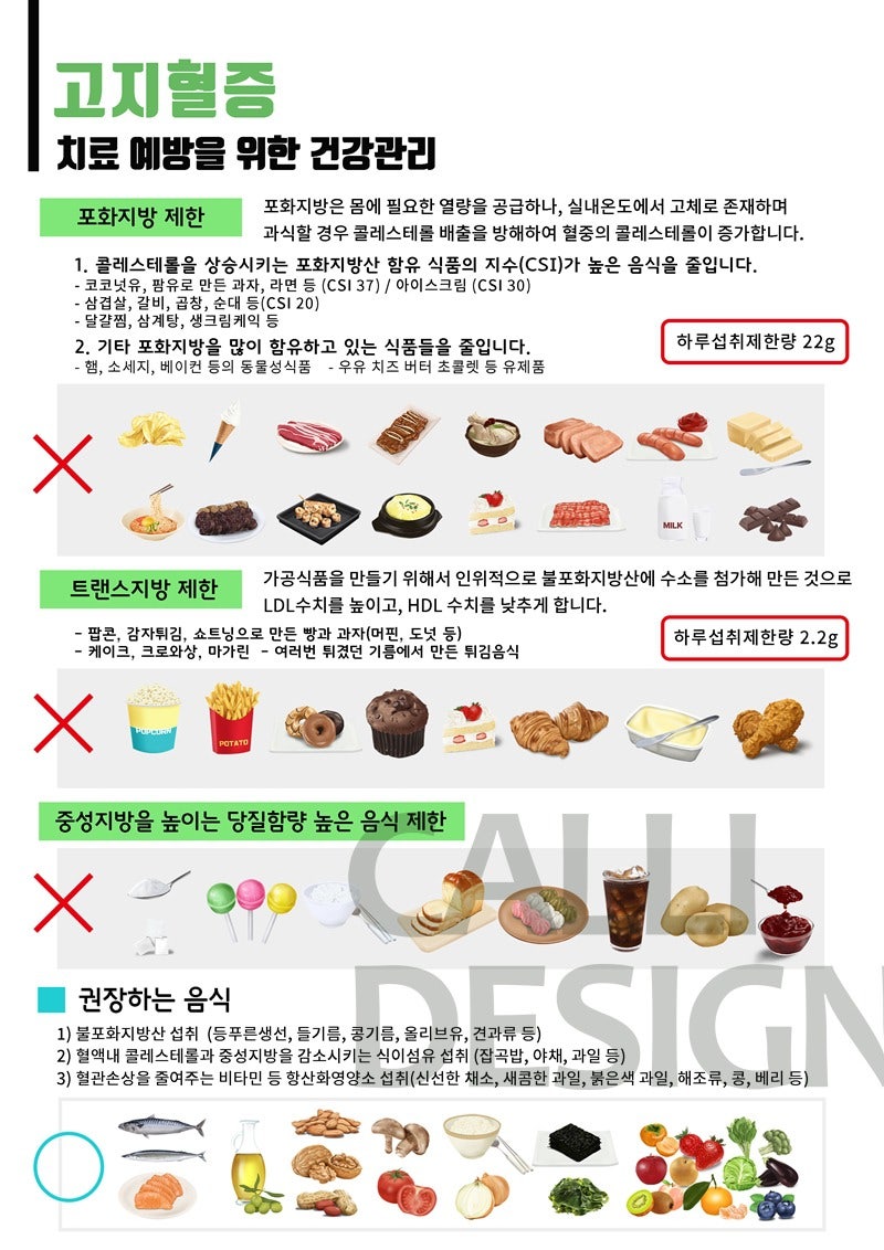고지혈증이나 심장병 가족력이 있고 나이가 40대 이상 및 심장병을 이미 앓은 적이 있는 경우 반드시 고지혈증 검진을 받아야 합니다. 중성지방과 콜레스테롤을 높이는 습관은 과음과 과식, 운동부족이 대표적입니다.고지혈증 관리 방법