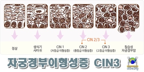 CIN1 경도의 자궁경부이형성증(Mild cervical dysplasia)으로 세포 기저층의 경미한 증식을 특징으로 합니다. 부여되는 질병 분류 번호는 N87.0입니다.CIN2 중등도 자궁경부이형성증(Moderate cervical dysplasia)에서 상피세포증 미분화분열세포의 증가를 볼 수 있습니다. 질병 분류 번호는 N87.1입니다.CIN3 중증 자궁경부이형성증(severecervical dysplasia)으로 주로 HPV-16형이 관찰됩니다. 질병 분류 번호는 N87.2가 적용됩니다.