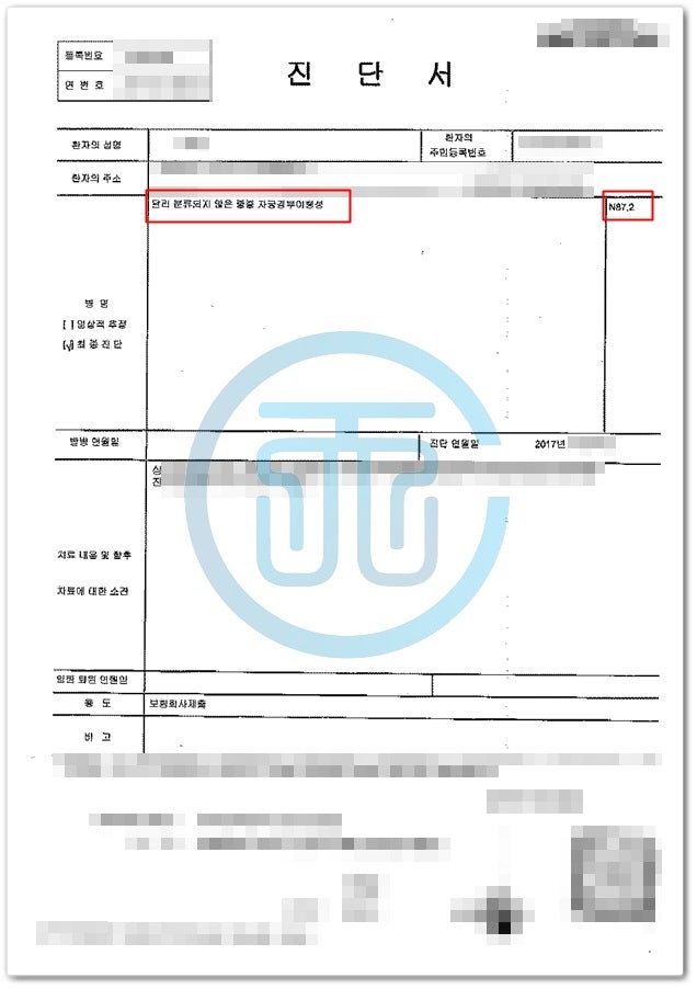 위 사례의 경우 조직검사 결과 CIN2-3단계로 판정되었습니다. 중등도와 중증에 해당하는 세포 변화가 나타나는 단계를 말합니다. 이런 경우 상피내암 인정 여부를 판단할 때 청구인분들은 대부분 진단서에 기재된 진단코드에 따라 보상이 이루어진다고 생각하게 됩니다.질병코드 N87.2는 여성생식기 염증성 질환에 적용되는 질병코드이므로 상피내암으로 인정되지 않습니다. 이 진단서들과 조직검사 결과지를 제출하면 보상직원들은 이렇게 말할 것입니다.진단코드를 상피내암에 해당하는 ‘D06’코드로 변경하여 제출해주세요! 주치의 중에는 진단코드를 변경하실 수도 있지만 더 큰 확률로 거절당할 수 있다는 점도 기억해야 합니다.