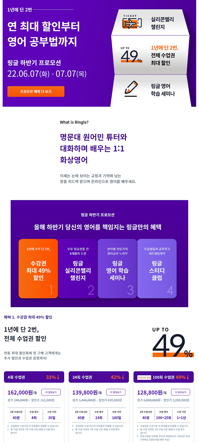 또한 1:1 수업의 강점은 수업시간 동안 충분히 말하고 듣는 훈련이 가능하다는 것입니다.전담 강사와 충분히 영어로 대화하고 즉석에서 피드백을 받는 것까지 해 영어에 노출될 수밖에 없는 환경이 조성됩니다.일방적으로 보고 듣는 수업이 아닌 계속 말하기에 초점을 두고 진행되기 때문에 국내 어학연수의 효과를 경험할 수 있습니다.