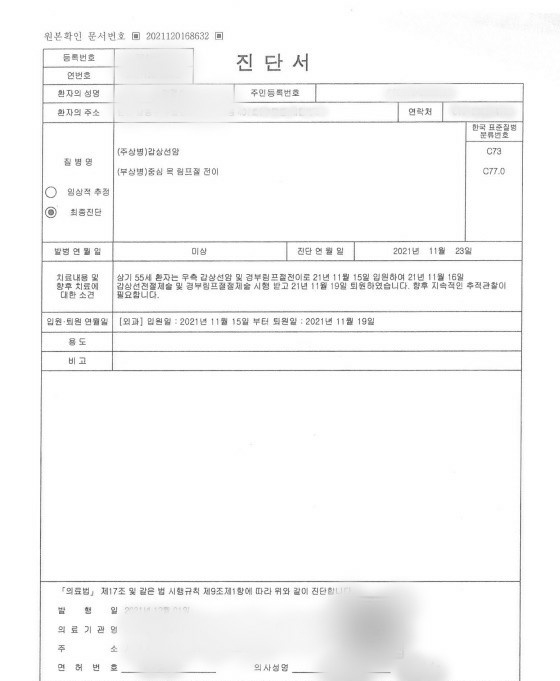 제 손님도 주상병으로 갑상선암(C73), 부상병으로 림프절 전이(C77) 진단을 받았고, 보험회사에 청구하여 암 진단금의 10%를 받았습니다. 대부분은 보험사에서 보험금이 나간다고 인정하고 끝나는 경우가 많은데 제 의뢰인은 검색해서 제 블로그를 보고 의뢰를 해주셨고 관련 의무기록과 보험 가입 당시의 관련 자료를 모두 요청해서 꼼꼼히 검토했습니다.