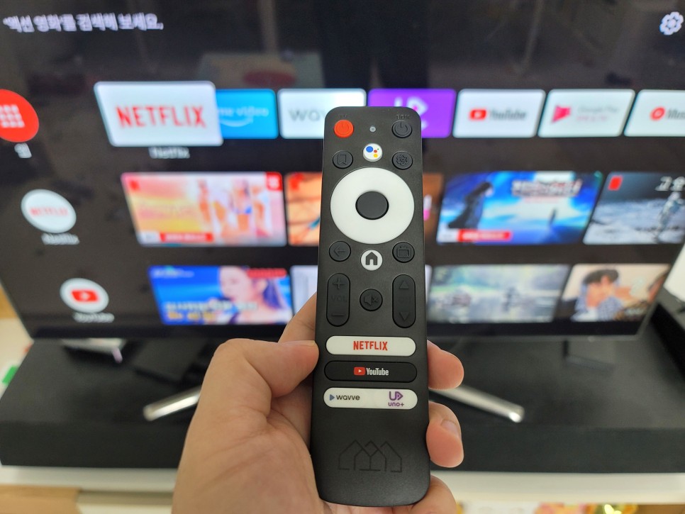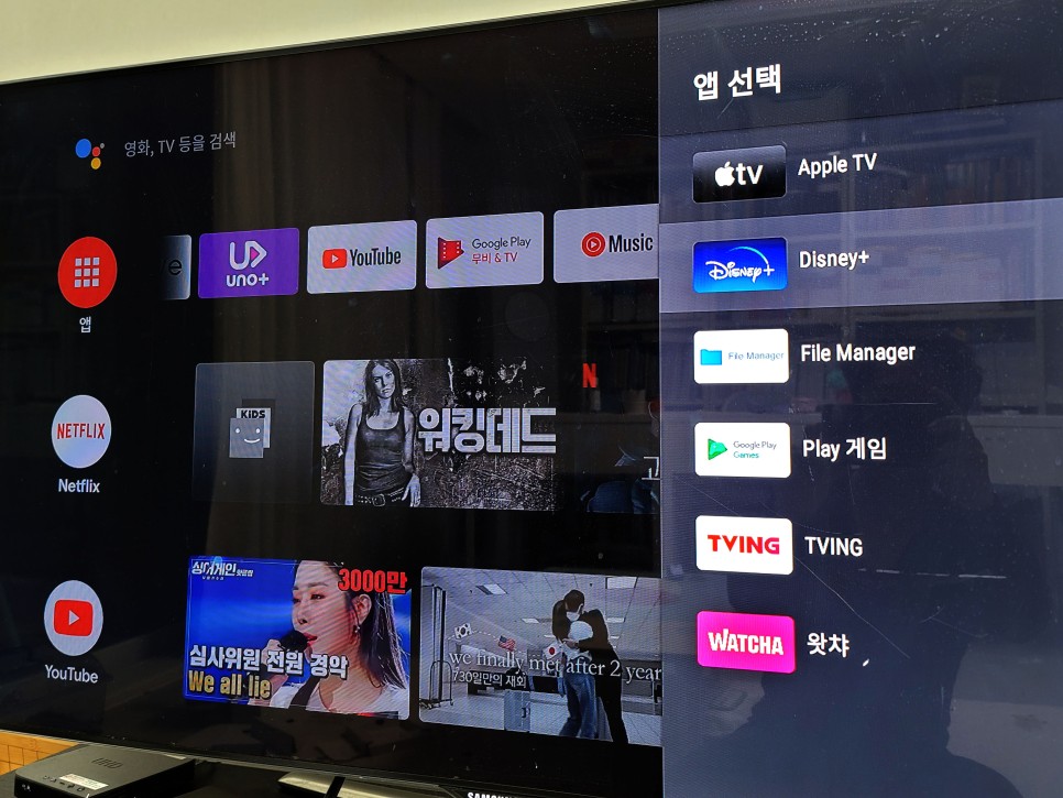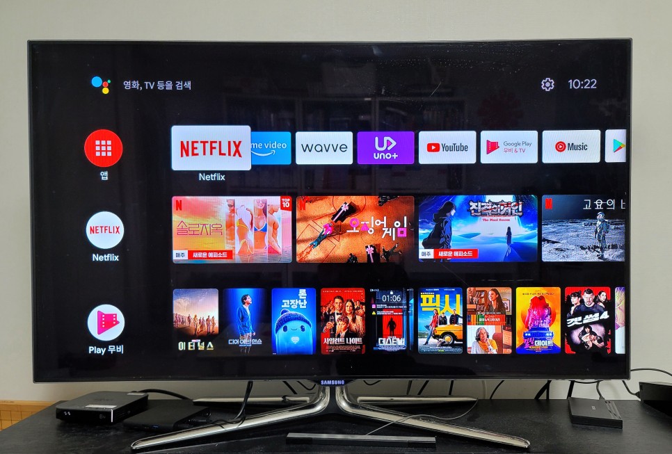 모든 설치가 완료되면 홈 화면에 넷플릭스, 웨이브, UNO+, YouTube 등을 바로 시청할 수 있는 앱이 상단에 표시됩니다.