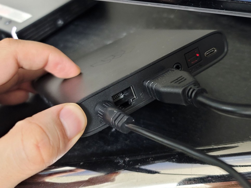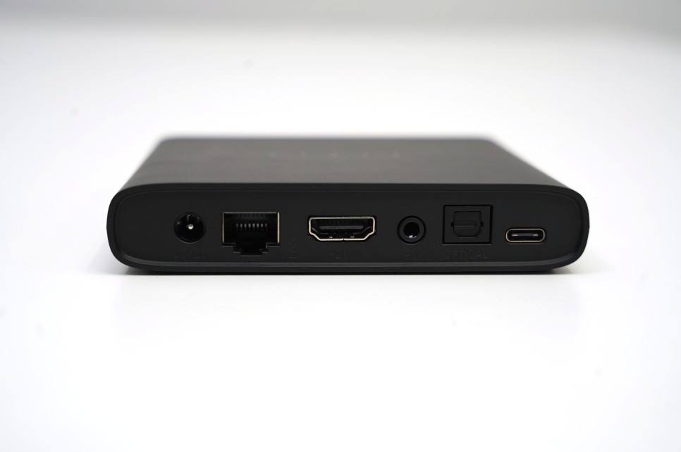 후면에는 여러가지 단자를 접속으로 끄는 포토가 있습니다. 왼쪽부터 전원 연결 포트, 이더넷 연결 포트, HDMI 포트, AV 포트, 옵티컬 포트, C타입 포트가 보입니다.