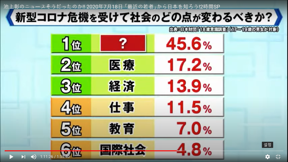 주말에 자주 보는 방송이 있어요.가끔 한국 얘기를 할 때는 ‘응?!뭐라고?!’ 할 때가 있지만 그래도 설명을 정말 알기 쉽게 잘 하는 이치가미 아키라 씨의 뉴스 해설을 즐겨 보는 방송입니다.이번 주말 방송의 주제는 일본의 젊은이들에게 “이번 코로나 사태를 보면서 일본 사회의 문제점, 개선해야 할 부분은 어떤 부분이냐”고 질문했습니다.