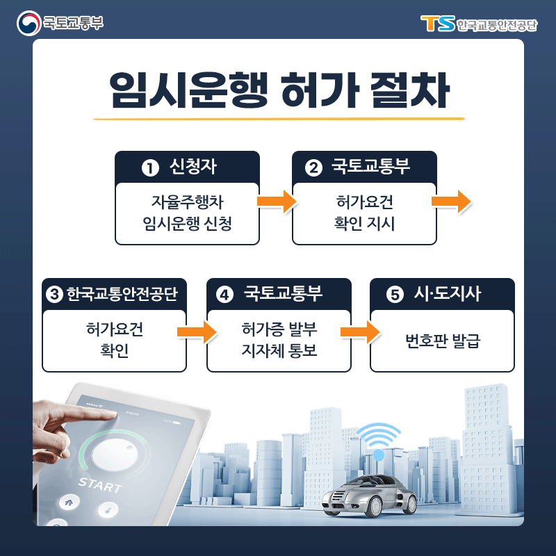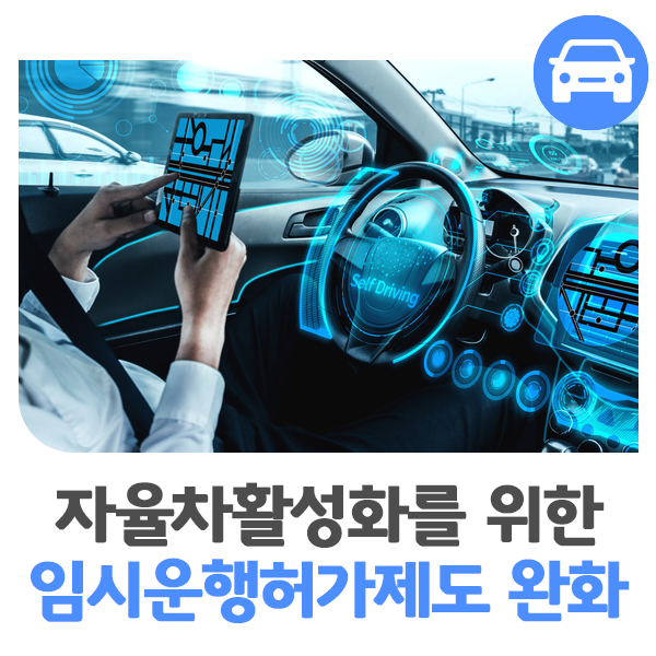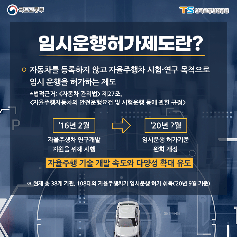 자율차 임시운행 허가제도란?자동차를 등록하지 않고, 자동 운전 자동차 시험, 연구 목적으로 임시 운행을 허가하는 제도입니다.