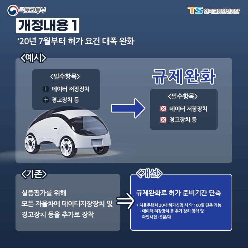 <개정 내용 1> ’20년 7월부터 허가요건이 대폭 완화됩니다. (필수 항목에서 데이터 저장장치, 경고장치 등을 제외)